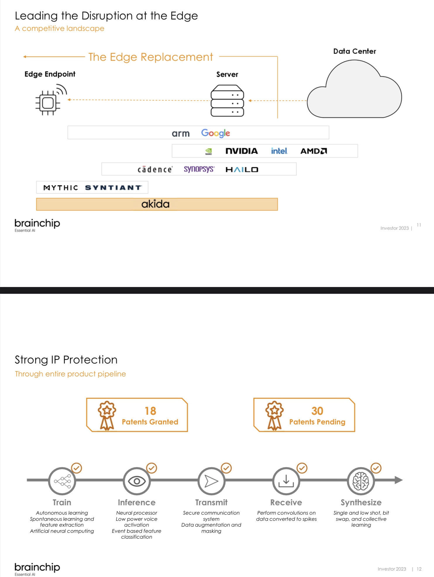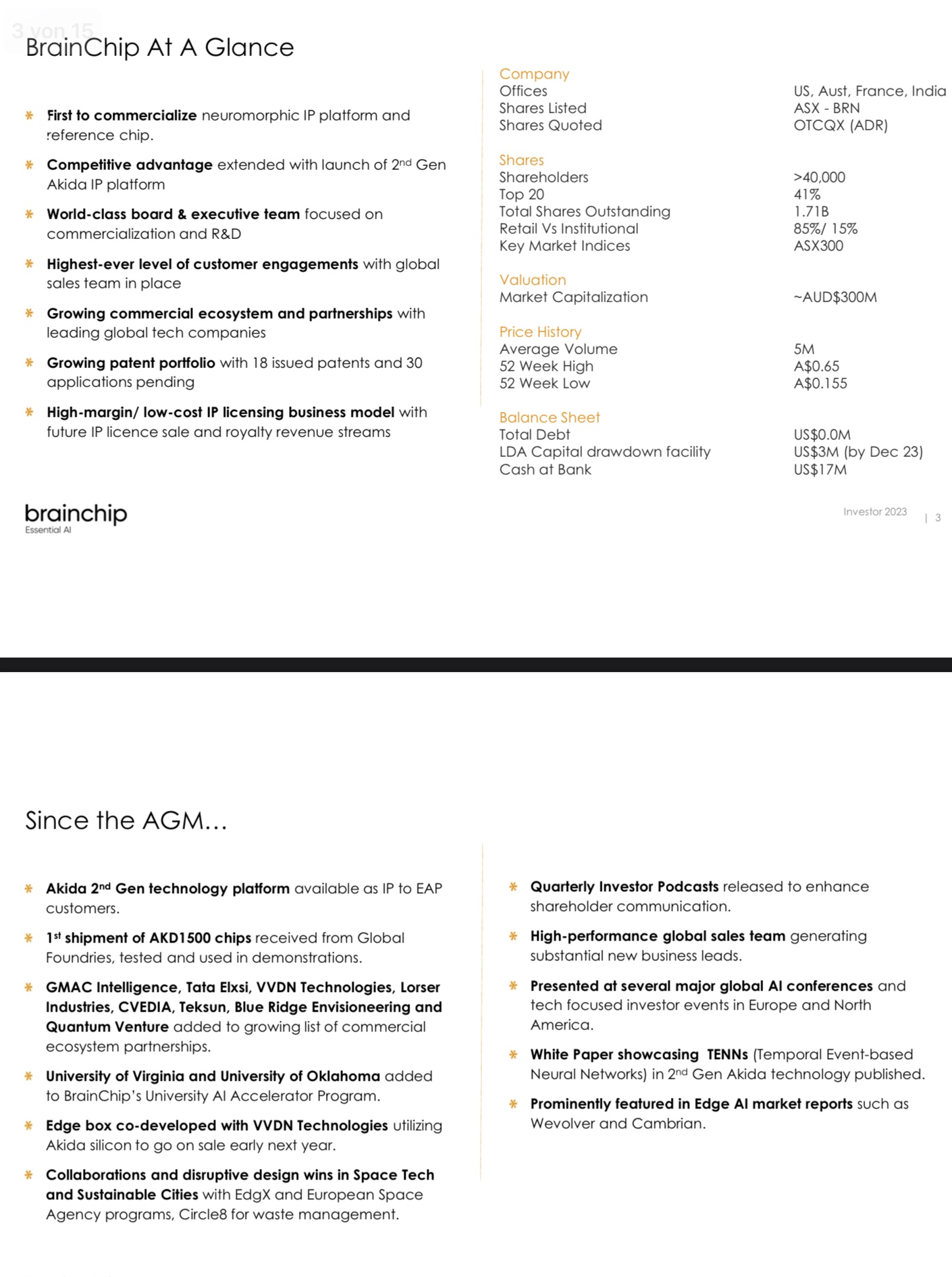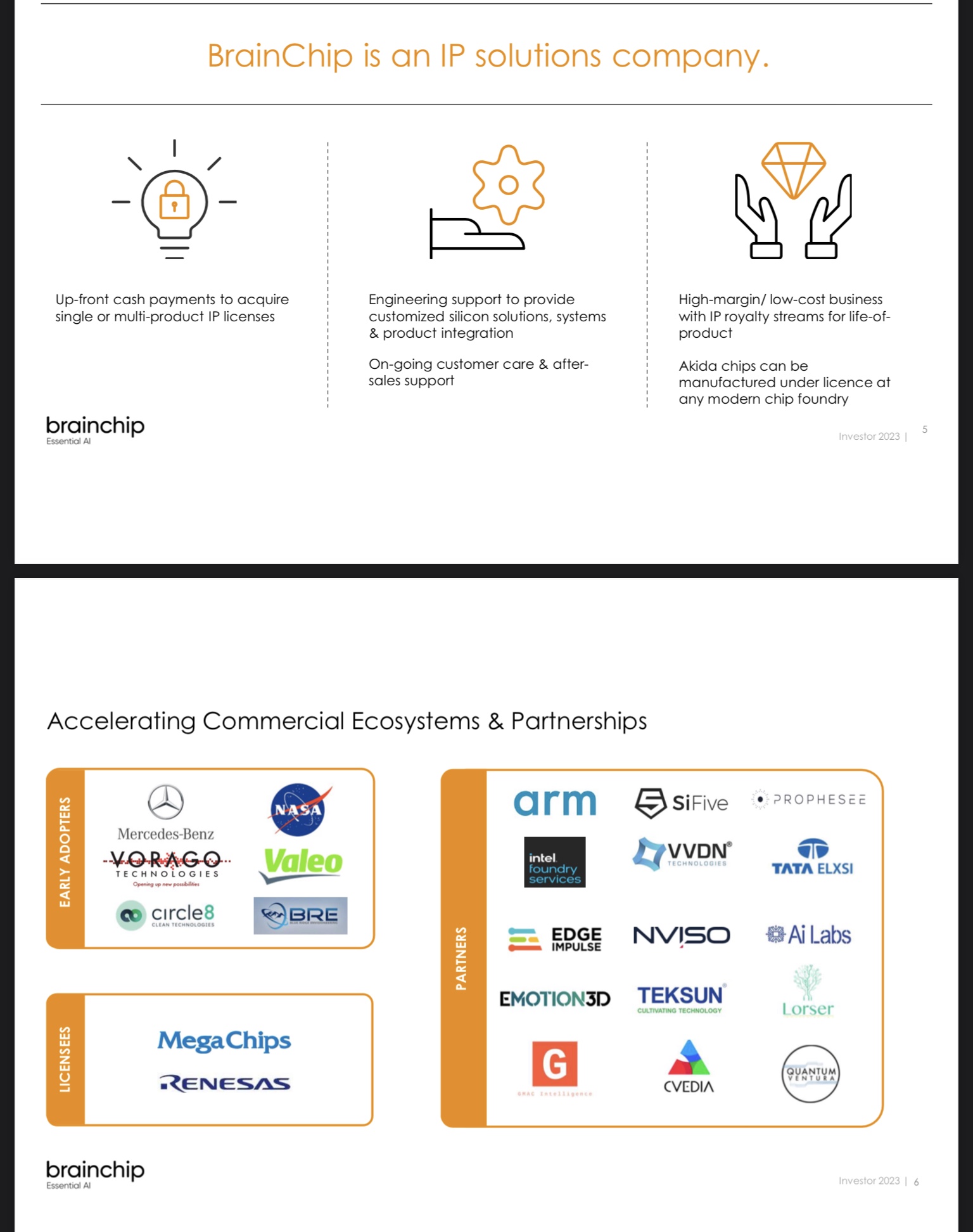 You would think if nothing was happening, or not on the horizon, that these names would not appear on the slide. If Valeo, or Mercedes, or NASA had stalled or decided to go with a different/competeitor technology, then they would not be listed here? If the "early adoption" of the technology was not true, or moving forward, or they decided to go with an alternative technology they would ask Brainchip to remove their name.