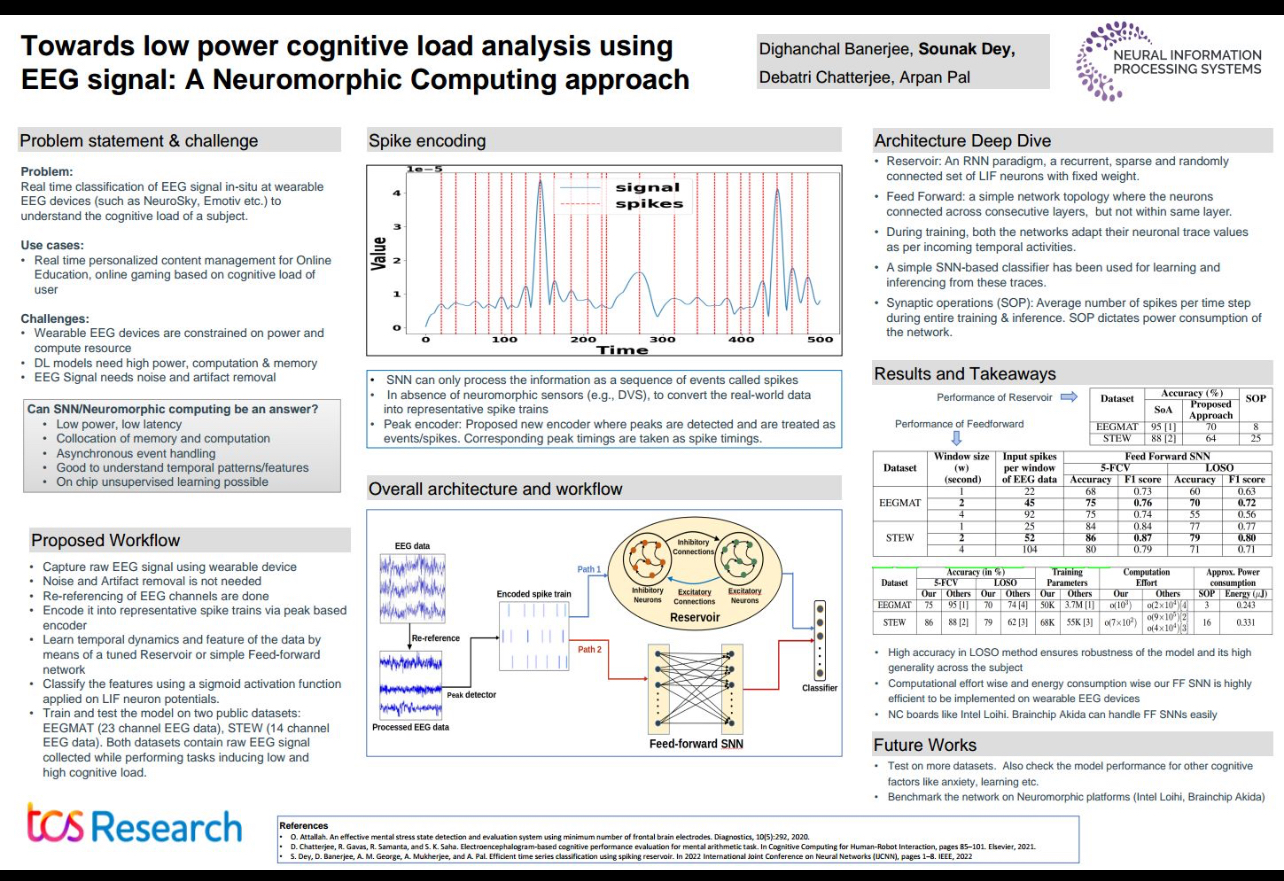 In an accepted paper titled "Towards low power cognitive load analysis using EEG signal: A neuromorphic computing approach" at NeurIPS 2023 MLNCP workshop, we have shown that spiking neural network (SNN) can offer pretty high accuracy in classifying the cognitive load of a user. The added advantage is, when it runs on neuromorphic hardware, it offers very real-time and very low power solution that can run on wearable EEG devices.