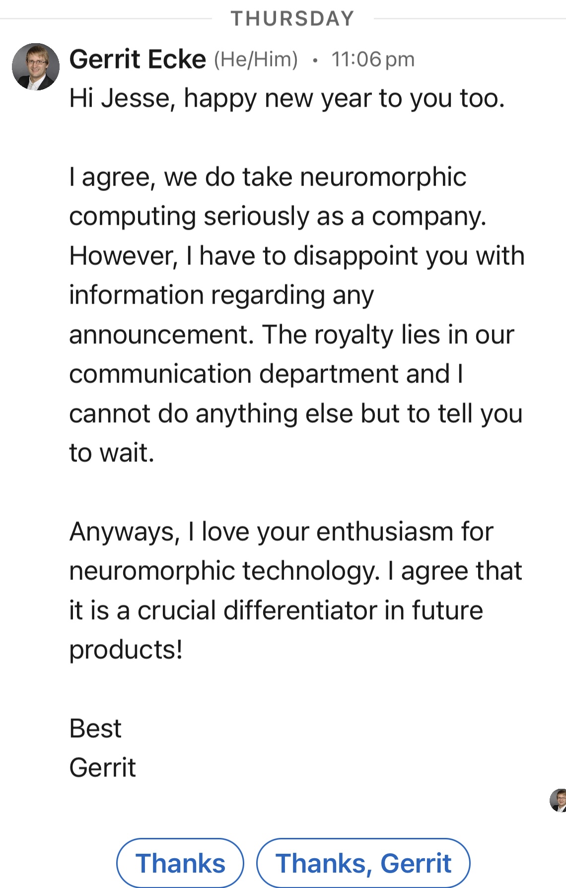 Given the recognition of Mercedes Benz of the 5 to 10 times better efficiency brought by AKIDA and the confirmation they are making their own chips and that they need to compensate for the energy excesses of Nvidia it is hard to imagine they are not finding themselves over an AKIDA barrel.