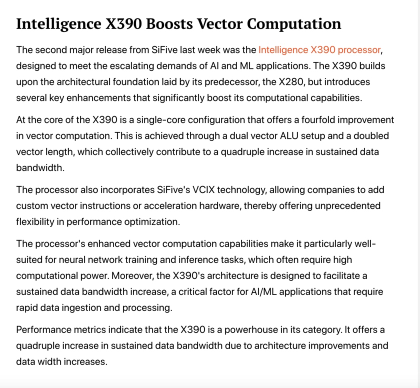 The Linkedin picture of the X390 with the High Performance NPU shows a Customer AI Hardware engine with the SiFive Intelligence family with the “footnoted” X390 is encouraging.