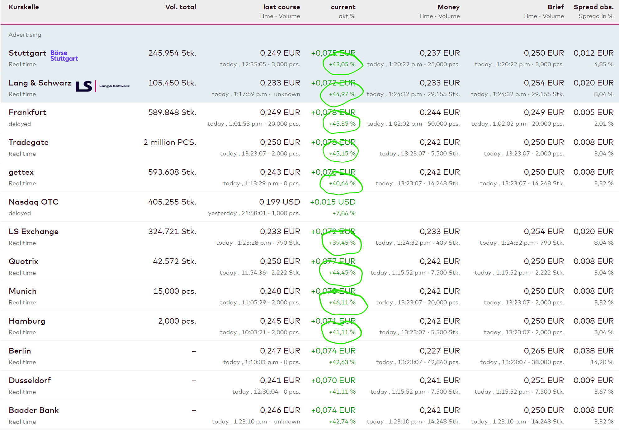 Wow - it's still rising. There are still 2½ hours to go.Hey CHIPS, during the Mercedes run, someone showed a website, that had all the German exchanges on the one page, with price and volumes, but I haven't been able to find it and the URL was on a phone that crapped itself..