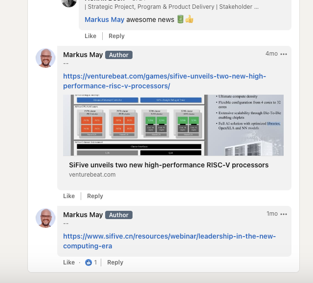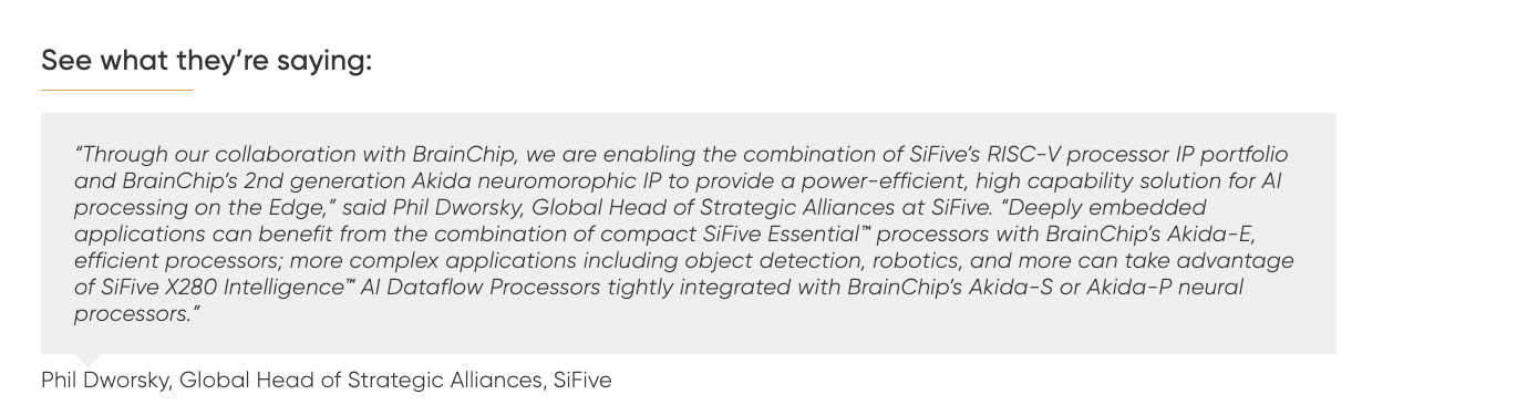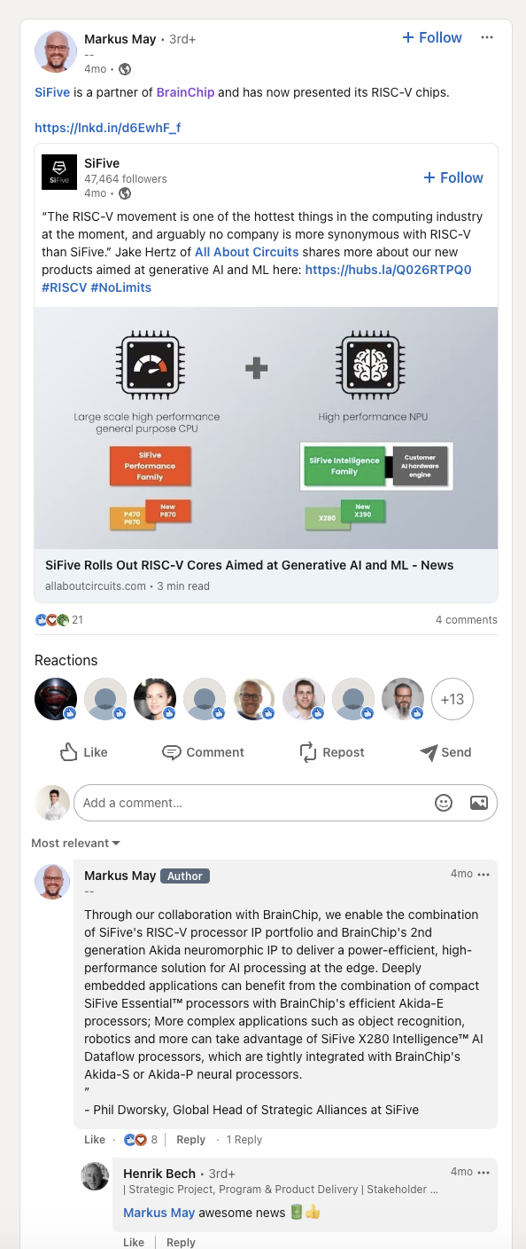 SiFive is a partner of BrainChip and has now presented its RISC-V chips. https://lnkd.in/d6EwhF_fwww.linkedin.com
