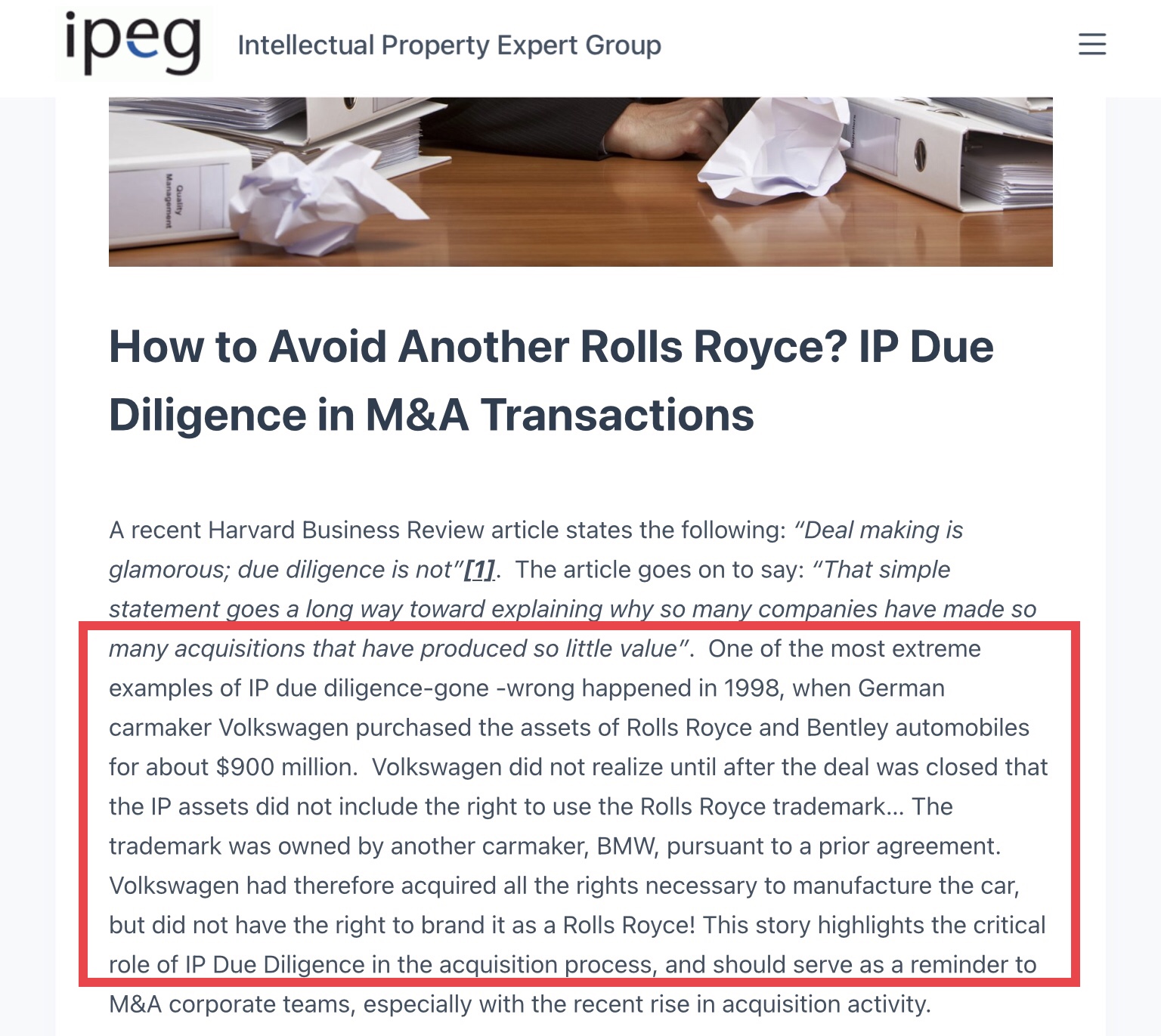 By the way, the story of the Rolls-Royce marque is a reminder of how important IP due diligence is…