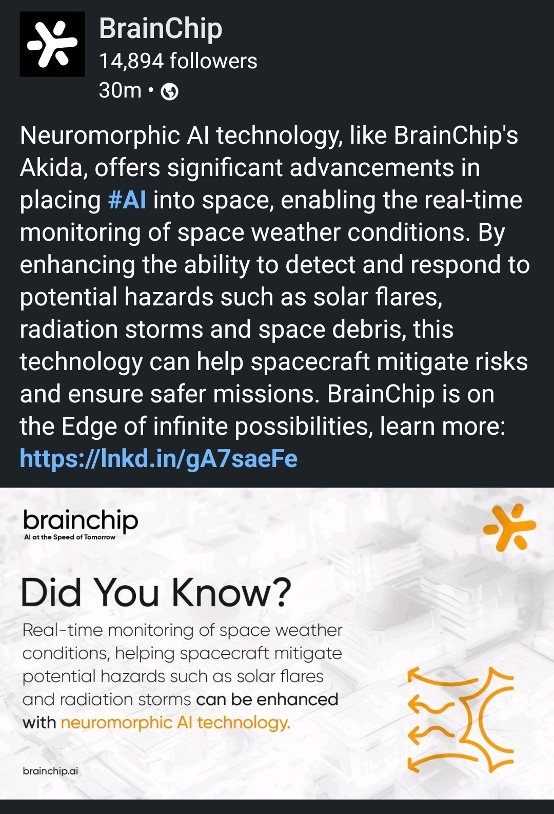 Neuromorphic AI technology, like BrainChip's Akida, offers significant advancements in placing #AI into space, enabling the real-time monitoring of space weather conditions. By enhancing the ability to detect and respond to potential hazards such as solar flares, radiation storms and space...www.linkedin.com