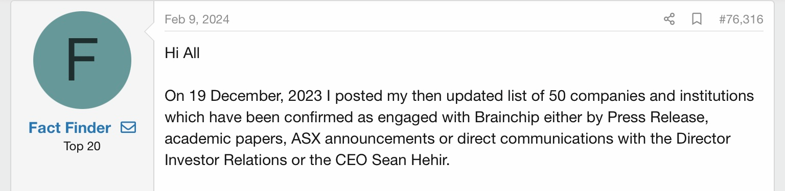 Does that include companies and institutions whose testing of Akida was made aware to BrainChip solely by virtue of an academic paper, detailing specific research our company had no idea was happening, as opposed to companies and institutions engaging with BrainChip openly or behind NDAs on a mutual basis? Personally, I’d rather not refer to the former as being “engaged with BrainChip”, since to me “engaged with” implies more than a one-time sales transaction via shop.brainchipinc.com - I’d much prefer categorising them as “companies and institutions researching Akida” (or similar) in order to differentiate.