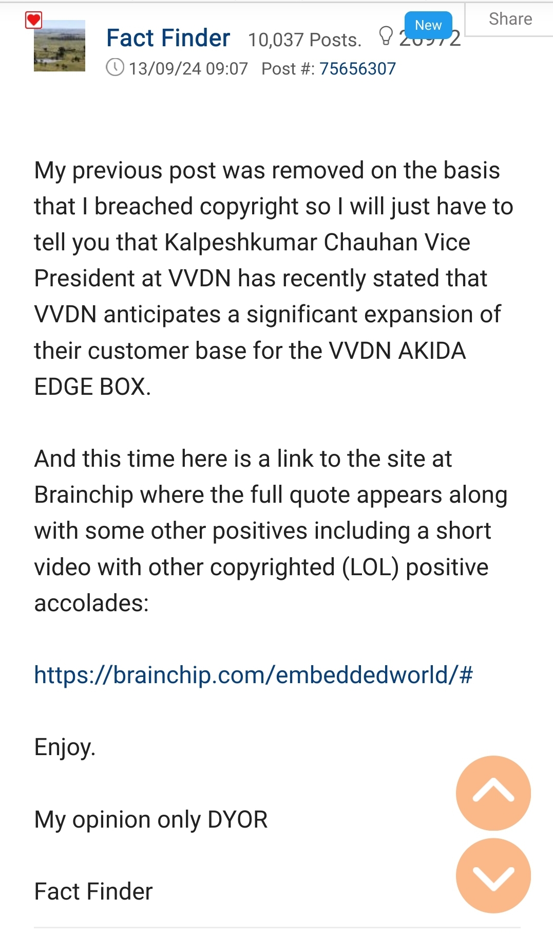 Absolutely hilarious, that multiple posters, must have complained about "copyright infringements" because he likely posted a screenshot, of the BrainChip website