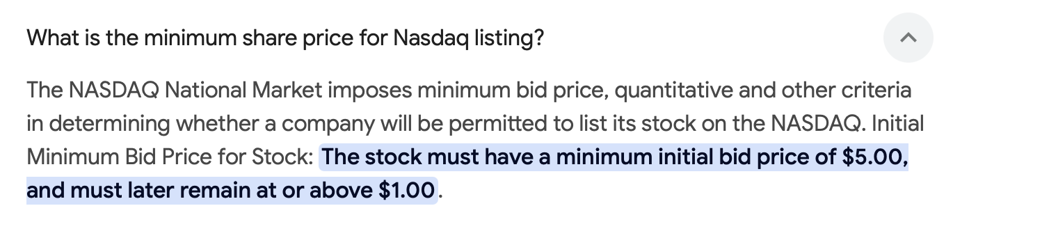 What scares me is our shareholding is divided by 40, so a share price of approximately $5 USD, but to remain on nasdaq must be $1USD or more. So once listed, if we drop below $5, not only are we highlighly diluted, but the value of our shares rapidly disappears..