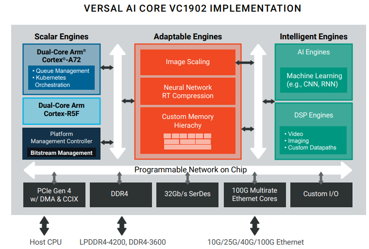 The Versal AI Core series solves the unique and most difficult problem of AI inference—compute efficiency—by coupling ASIC-class compute engines (AI Engines) together with flexible fabric (Adaptable Engines) to build accelerators with maximum efficiency for any given network, while delivering low power and low latency. Through its integrated shell—enabled by a programmable network on chip and hardened interfaces— Versal SoCs are built from the ground up to ensure streamlined connectivity to data center compute infrastructure, simplifying accelerator card development.