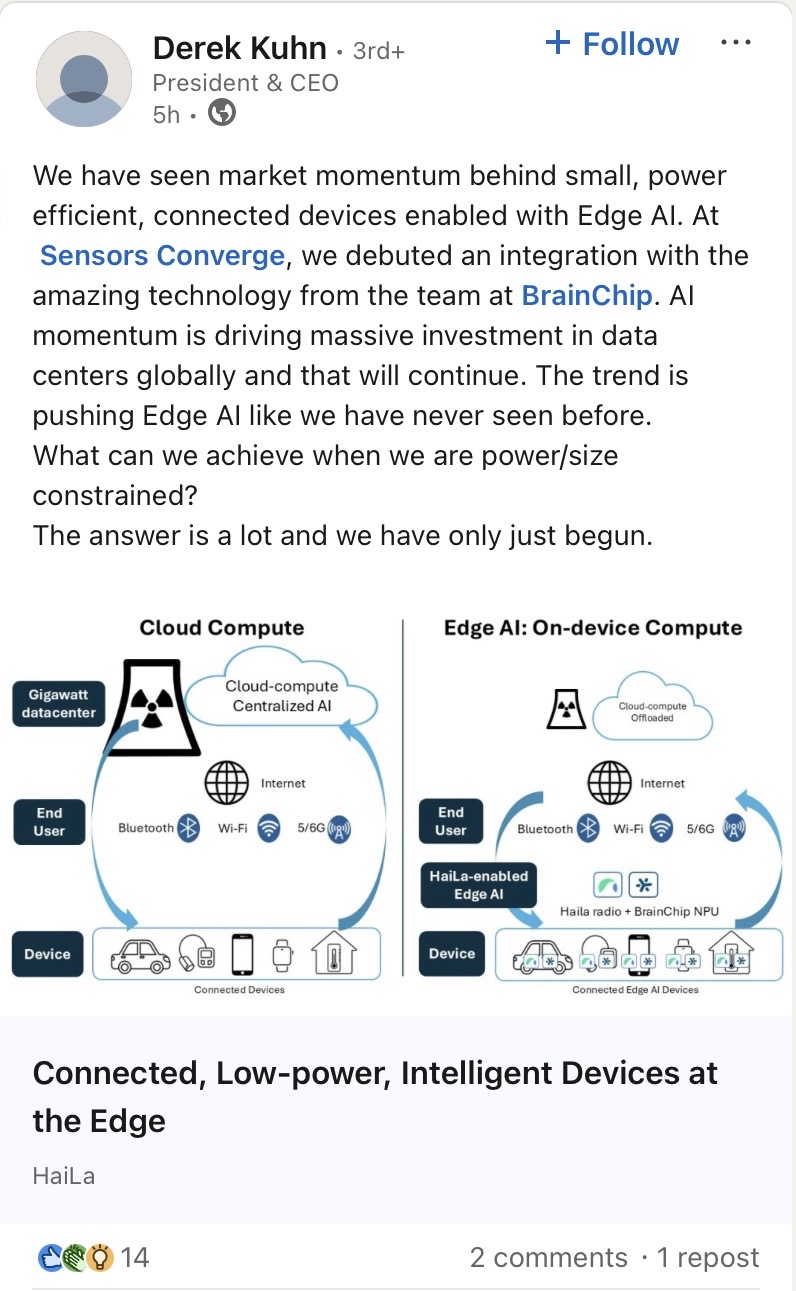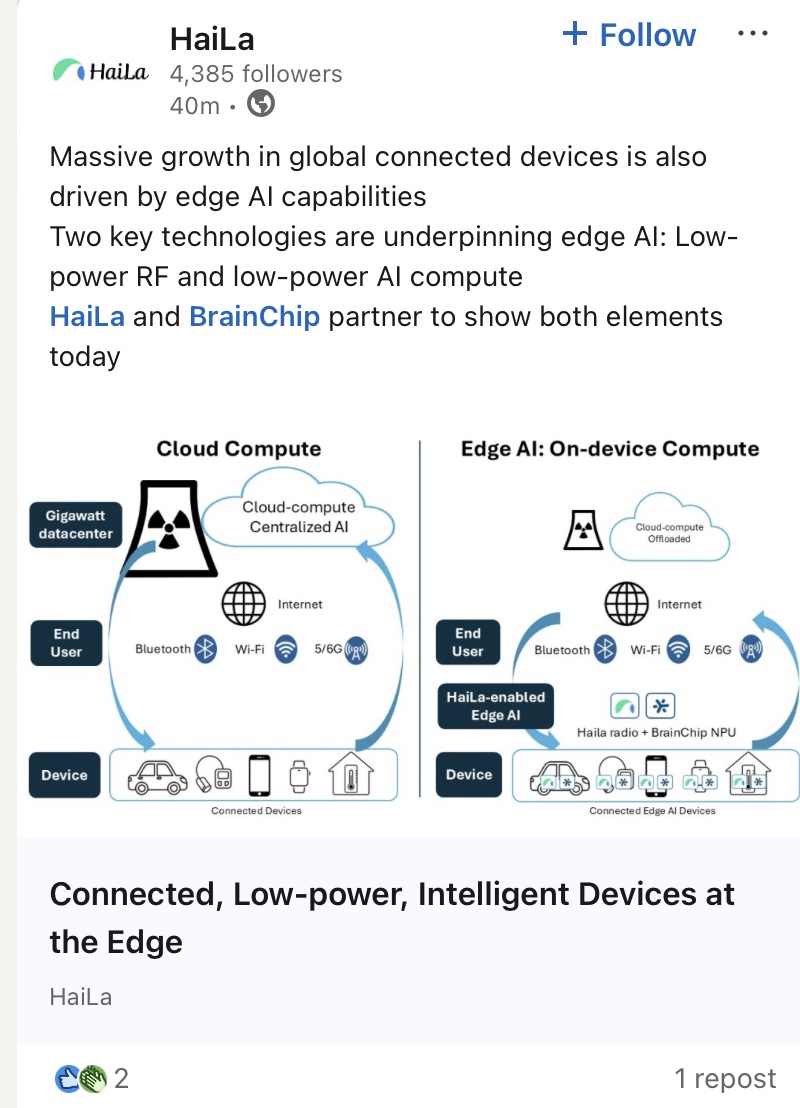 HaiLa’s core specialization in extreme low-power radio technology over standard protocols like Wi-Fi, Bluetooth, and even cellular, delivers one of the critical enablers of pervasive edge AI: extreme low-power data transmission. Together with BrainChip’s innovative edge compute, this opens up a broad range of options for end-users to support energy-efficient, on-device AI.Edge AI represents a powerful shift in how intelligent systems operate—bringing the power of AI directly to the devices at the heart of the connected world. By combining efficient NPUs with low-power wireless communication, edge AI systems can run independently, securely, and with minimal energy use. As more industries adopt this technology, we can expect smarter, more responsive, and more sustainable solutions for multiple applications.