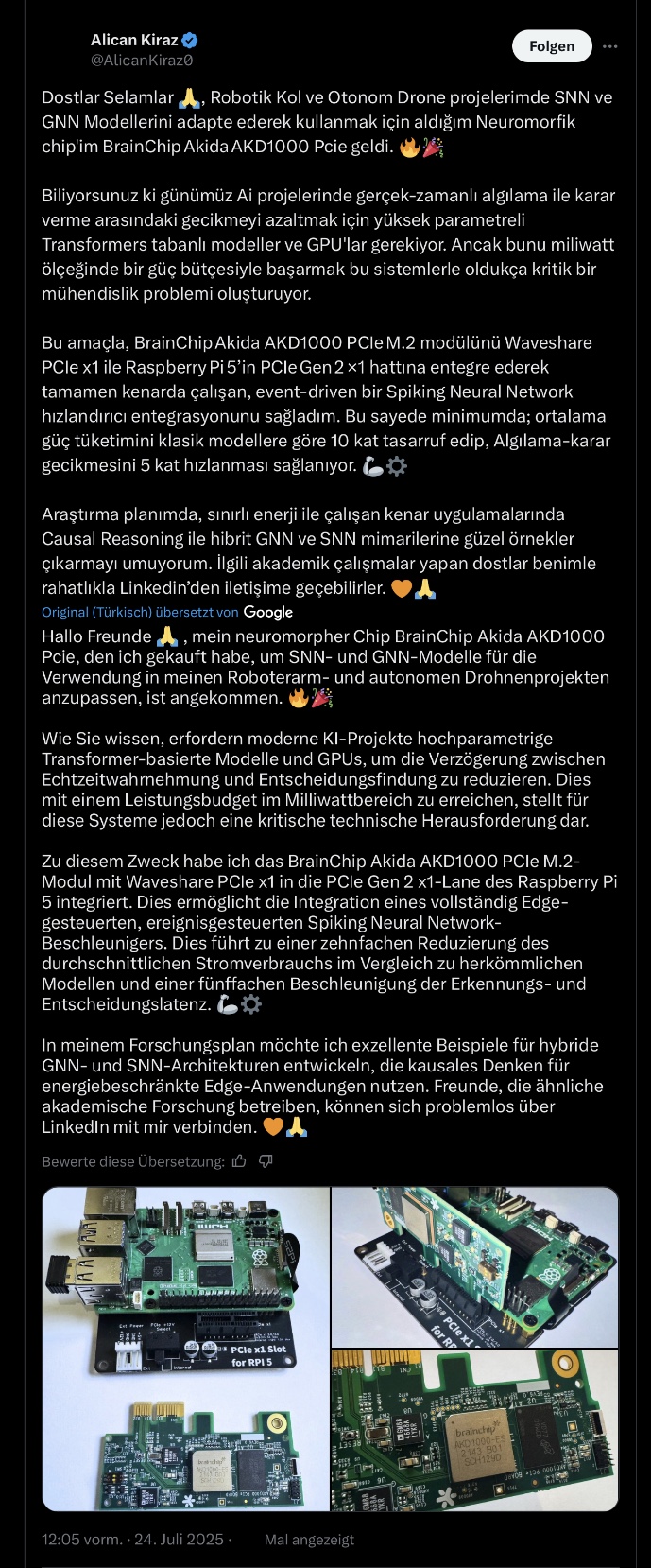 Here is another post by Istanbul-based Alican Kiraz, Head of Cyber Defense Center @Trendyol Group, which links to a Medium article written by him titled “Hybrid SNN Models and Architectures for Causal Reasoning in Next-Generation Military UAVs” that gives us a little theoretical background regarding the PoC he is envisaging, for which he will be utilising his newly purchased Akida Mini PCIe Board: