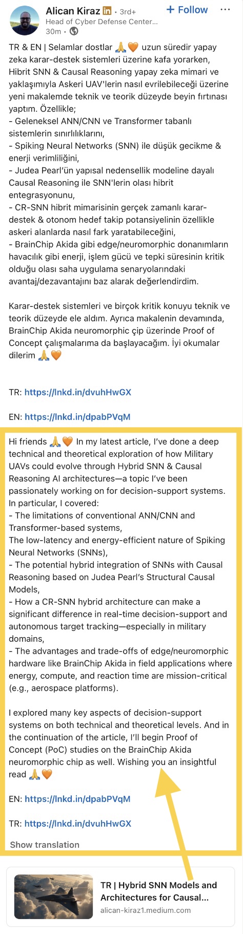 TR & EN | Selamlar dostlar 🙏 uzun süredir yapay zeka karar-destek sistemleri üzerine kafa yorarken, Hibrit SNN & Causal Reasoning yapay zeka mimari ve yaklaşımıyla Askeri UAV'lerin nasıl evrilebileceği üzerine yeni makalemde teknik ve teorik düzeyde beyin fırtınası yaptım. Özellikle; -...