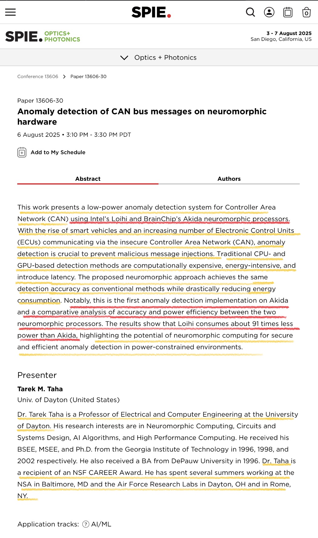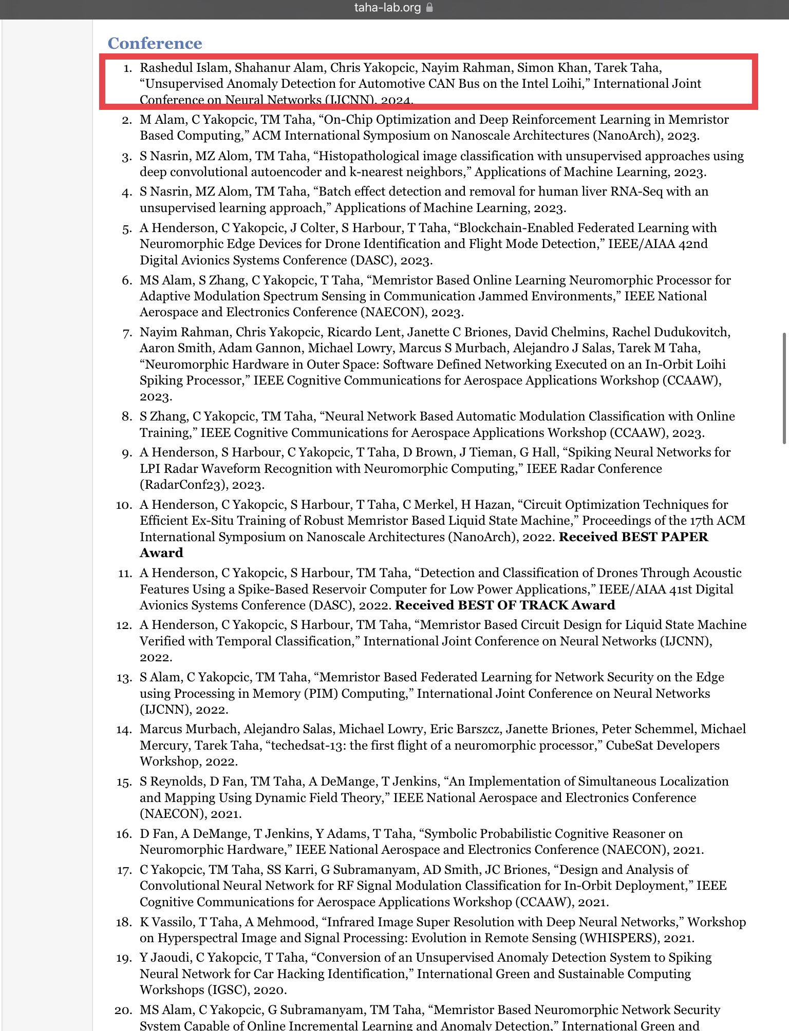 The only conference paper listed on Tarek Taha’s website, which appears to be relevant to the topic, happens to be the 2024 paper “Unsupervised Anomaly Detection for Automotive CAN Bus on the Intel Loihi”: