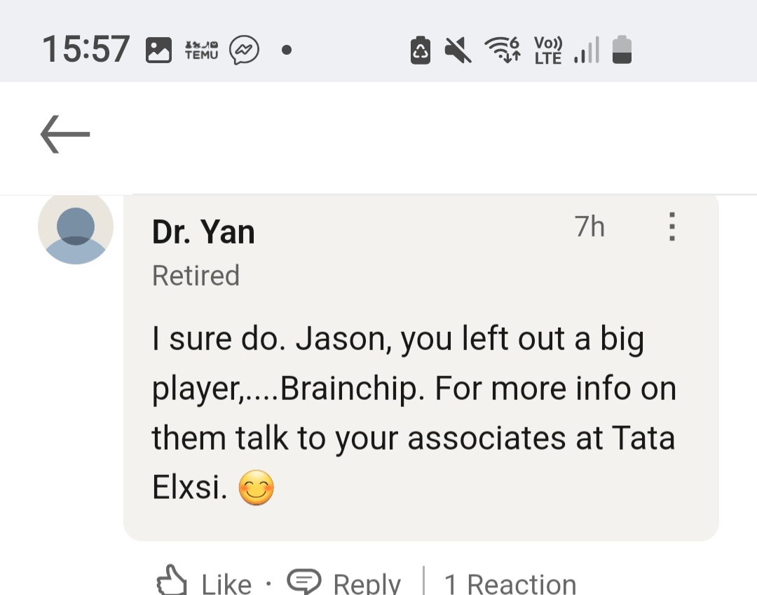 But he is aware of the other two fascinating examples........but not Akida....rubbishYou know… An Associate Software Engineer at Tata Consultancy Services wouldn’t necessarily know about the BrainChip–Tata Elxsi collaboration…..TCS and Tata Elxsi are separate Tata Group companies with different focus areas. The partnership with BrainChip is tied to Tata Elxsi (automotive, semiconductor, embedded AI), not TCS, so a junior engineer at TCS is unlikely to be aware of it unless he follows industry news personally…. I mean… he mentioned Loihi… which is still in research mode IMO