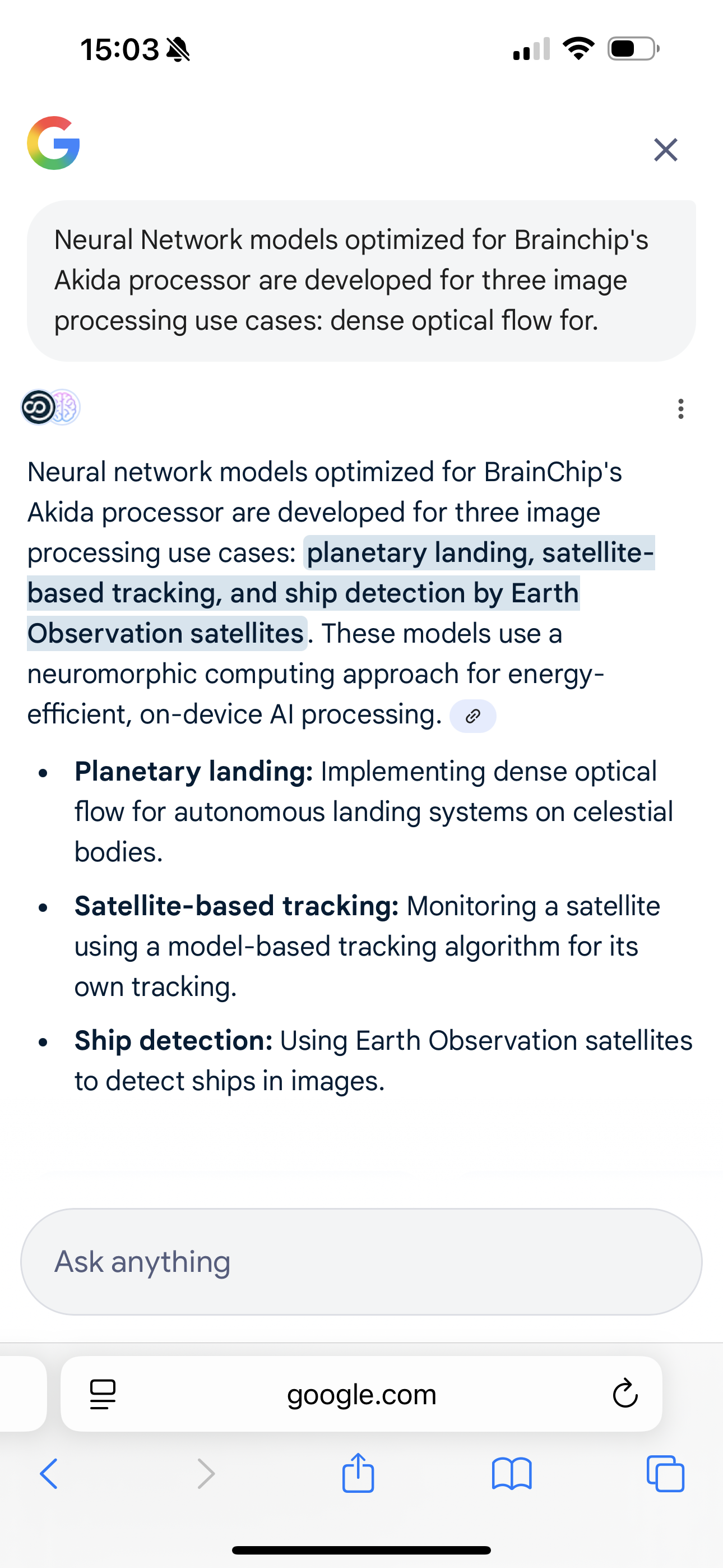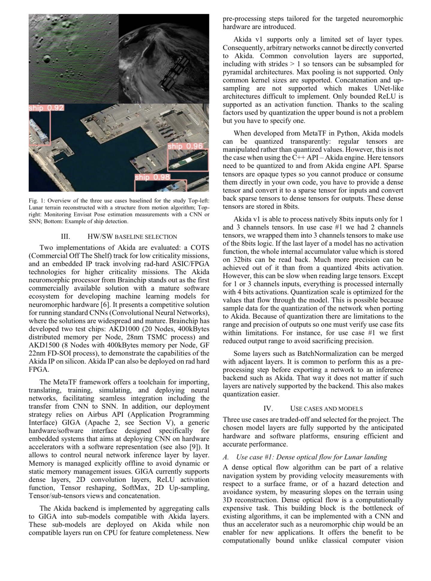 “Two implementations of Akida are evaluated: a COTS (Commercial Off The Shelf) track for low criticality missions, and an embedded IP track involving rad-hard ASIC/FPGA technologies for higher criticality missions.”