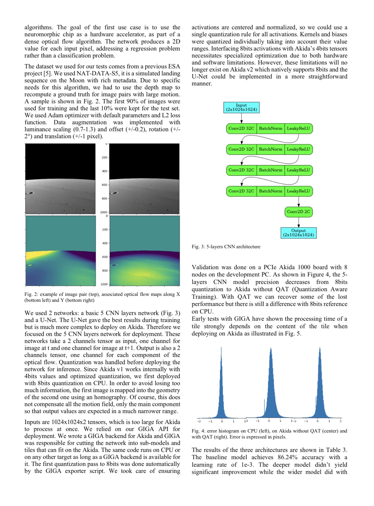 We successfully tested three different kinds of neural networks on Akida v1 accelerator. The acceleration factor with respect to a regular CPU is interesting for highly demanding computer vision workloads. The Akida v1 is well suited for classification tasks but imposes limitations for regression tasks such as dense optical flow. We demonstrated that we need at least 8bits quantization to address this class of problems which means it will be fully possible with Akida v2. Execution time for AI models are usually deterministic with dense tensor processors, but since SNN rely on sparse processing capabilities, it introduces a dependency to processed data. In addition, it was not clear that SNN could be wrapped into a dense, layer by layer, API like GIGA but we demonstrated it is possible. This is important for portability as the choice of a platform depends on many factors, not only processing performance or efficiency.