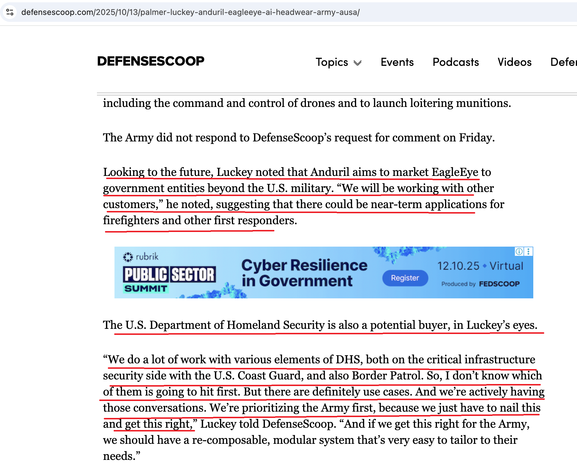 Also noteworthy is that Palmer Luckey has said Anduril plans to market EagleEye beyond the US military, to firefighters and first responders and he expects interest from US Department of Homeland Security, including the USCoast Guard and Border Patrol.