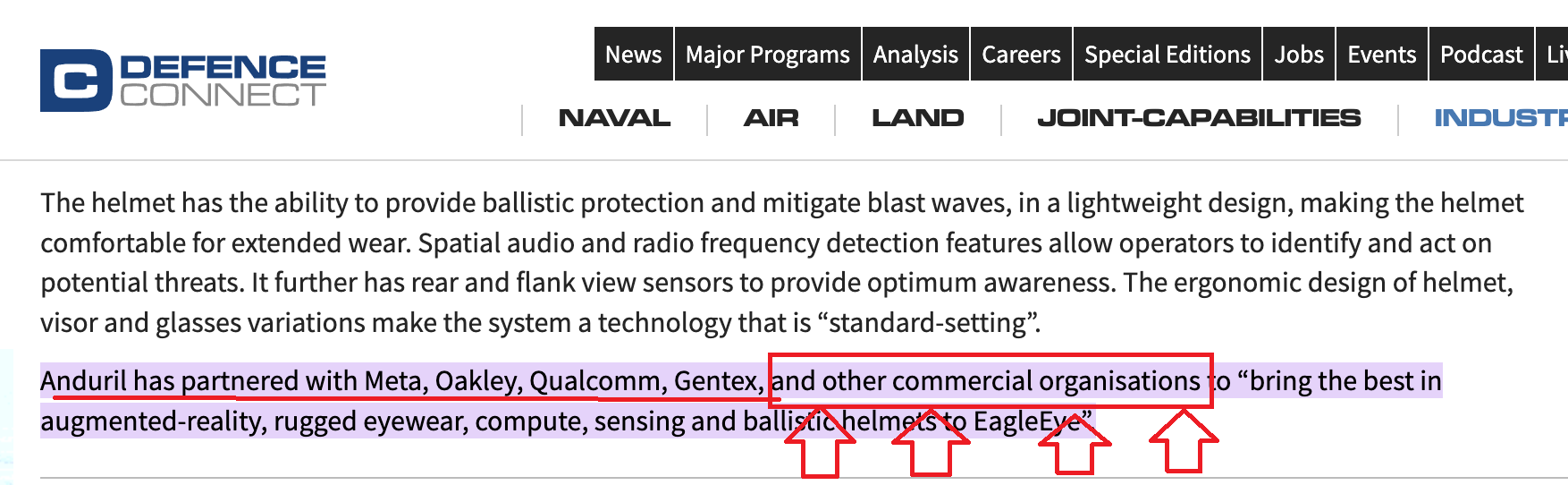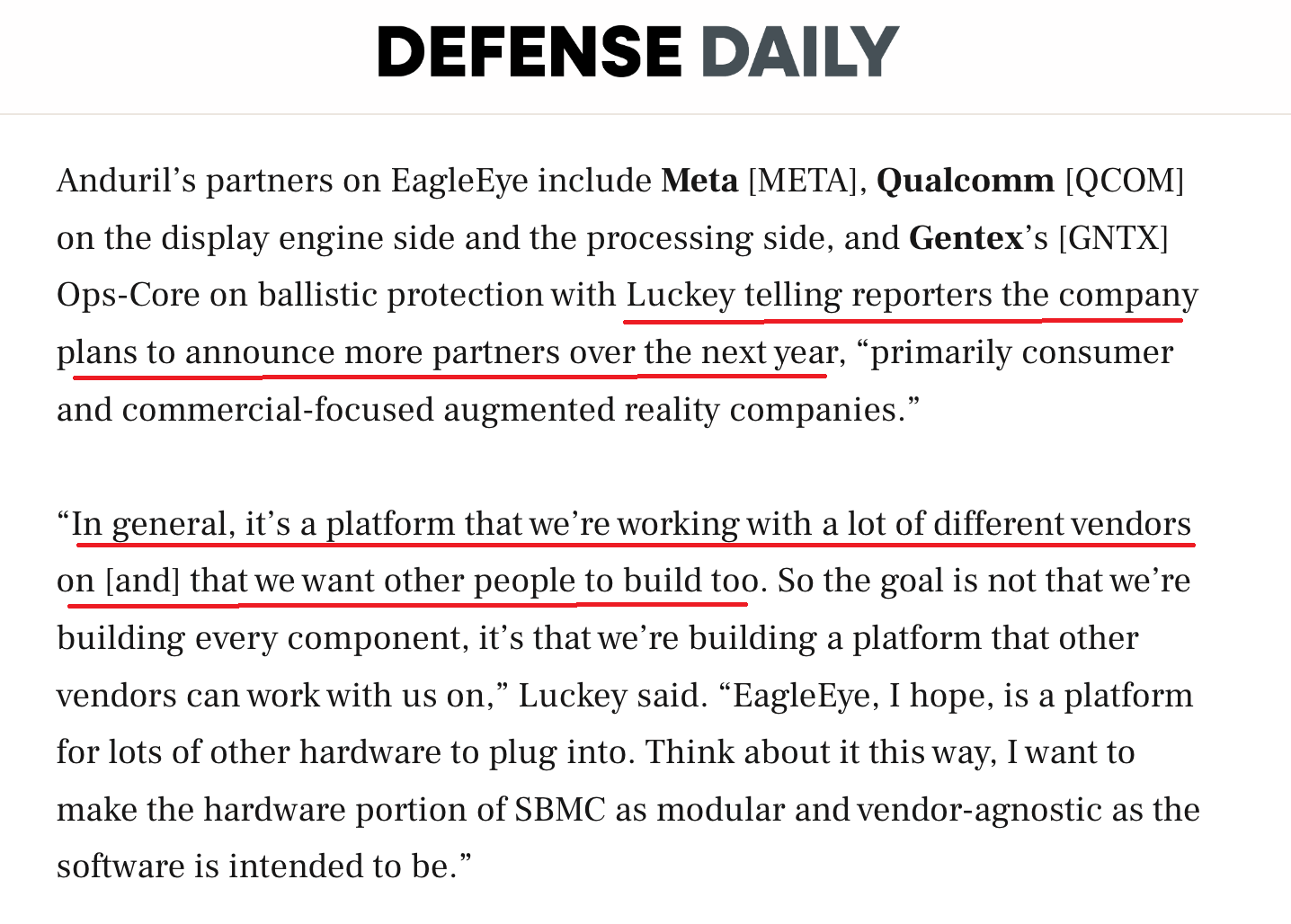 The EagleEye partners publicly named by Anduril so far are Meta, Oakley Qualcomm and Gentex. But as you can see from the two extracts below "other commercials organisations are also involved" with "Luckey telling reporters the company plans to announce more partners over the next year". So if we are involved, an announcement could land within that window.