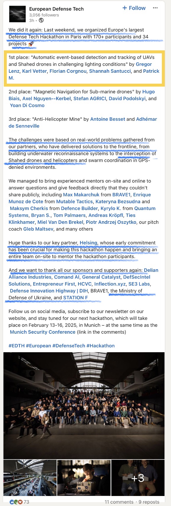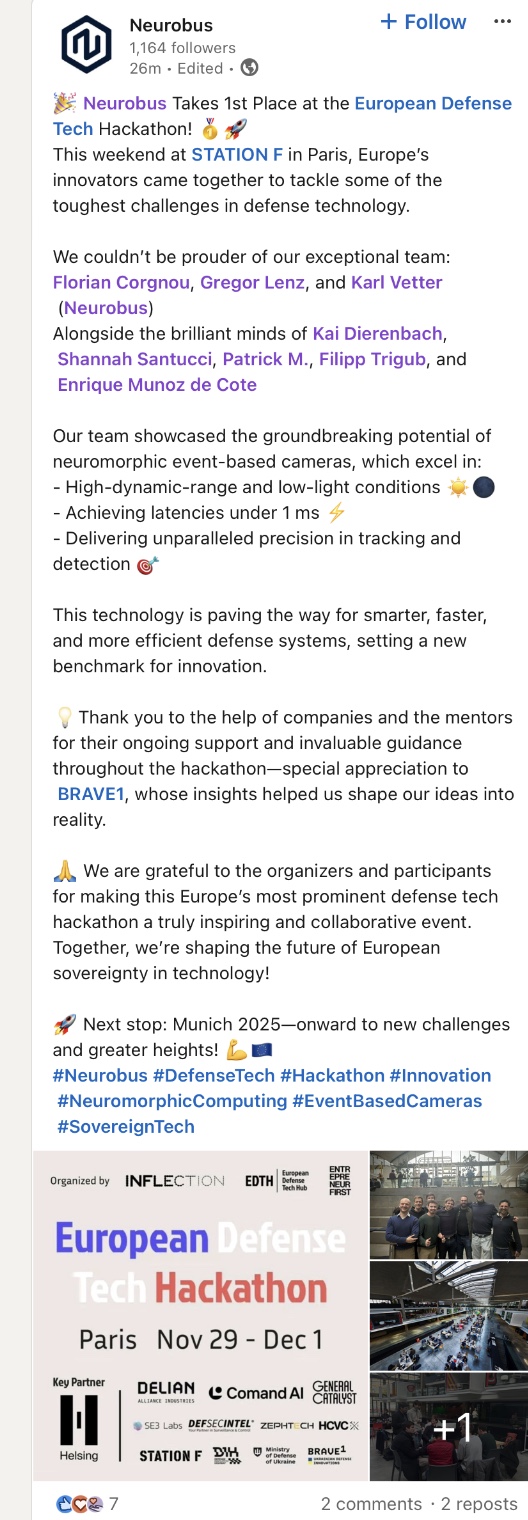 One teammate, Shannah Santucci, had already won 1st place in the December 2024 European Defense Tech Hackathon with - among others - Florian Corgnou, Gregor Lenz and Karl Vetter, all from Neurobus (Gregor Lenz has since left the Paris and Toulouse-based startup and joined Paddington Robotics in London).