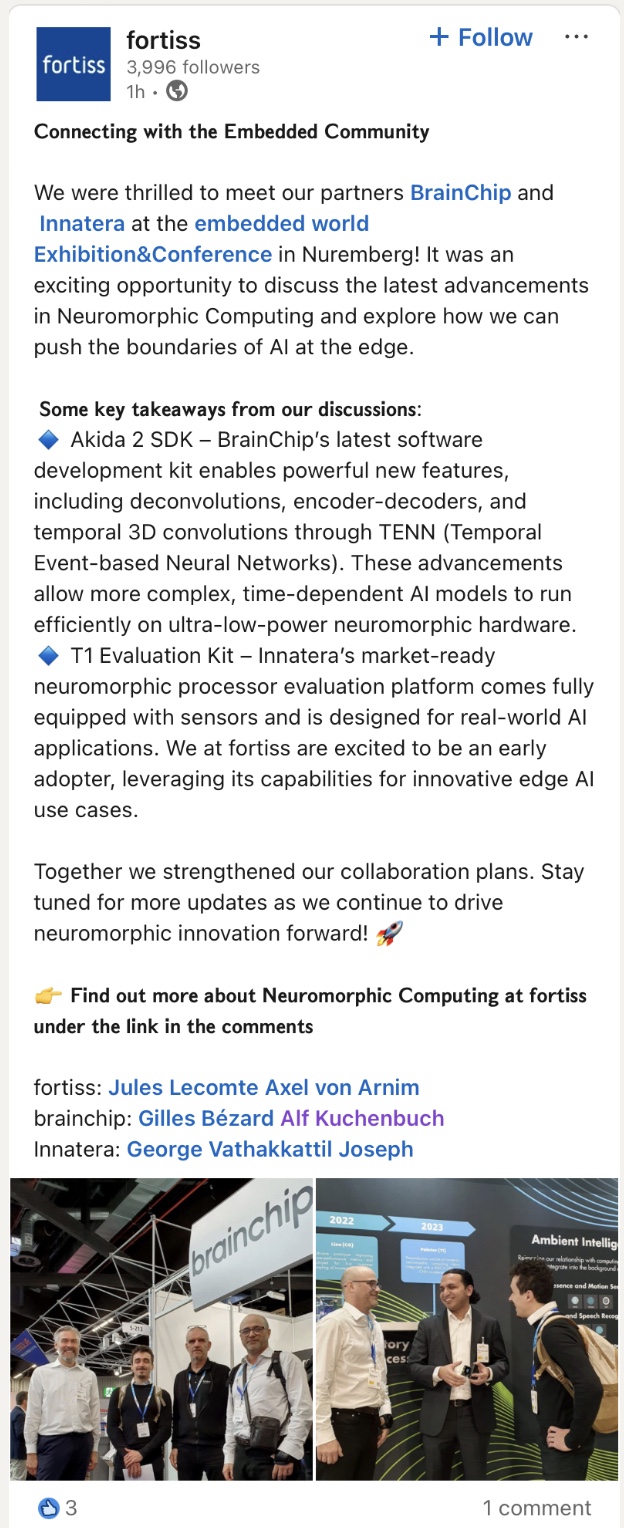 𝗖𝗼𝗻𝗻𝗲𝗰𝘁𝗶𝗻𝗴 𝘄𝗶𝘁𝗵 𝘁𝗵𝗲 𝗘𝗺𝗯𝗲𝗱𝗱𝗲𝗱 𝗖𝗼𝗺𝗺𝘂𝗻𝗶𝘁𝘆 We were thrilled to meet our partners BrainChip and Innatera at the embedded world Exhibition&Conference in Nuremberg! It was an exciting opportunity to discuss the latest advancements in Neuromorphic Computing and explore how we can push the boundaries of...