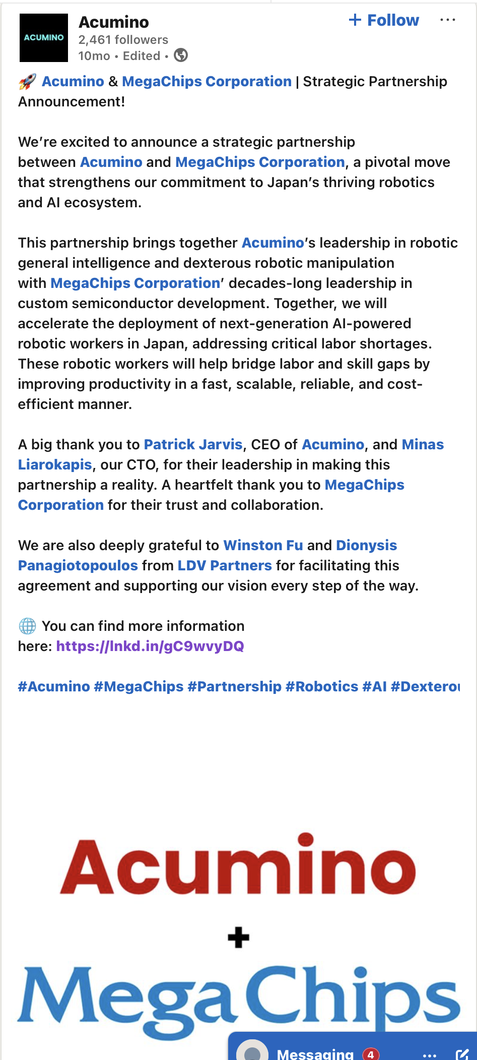 From the news area of Acumino's website. Scroll down to Strategic Partnership with Megachips (01/2025).