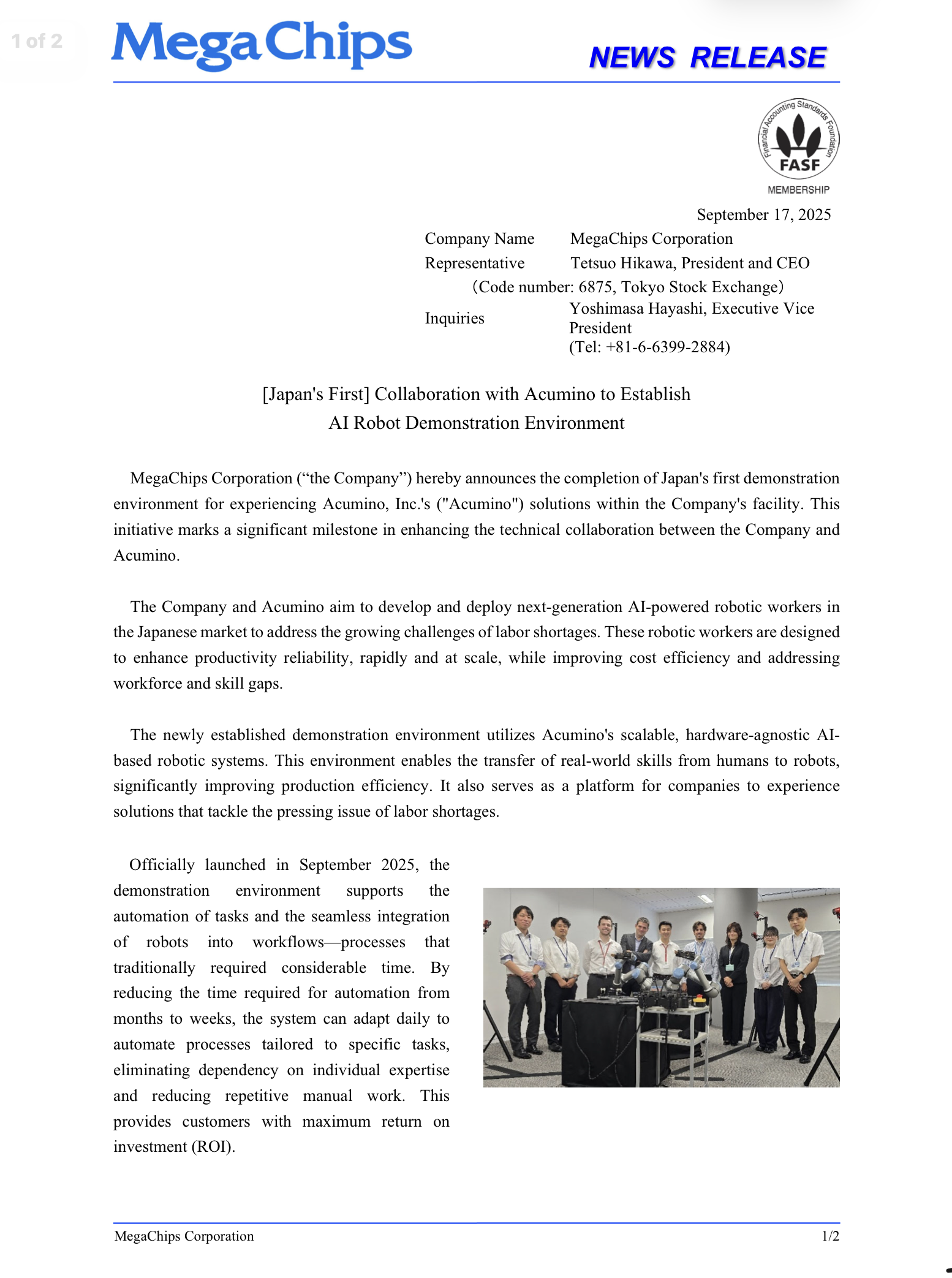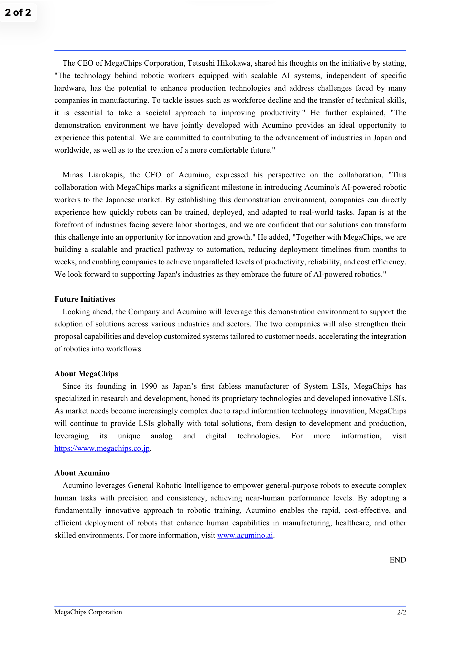 Acumino and Megachips will collaborate to develop and deploy next generation AI powered robotic workers in Japan.....