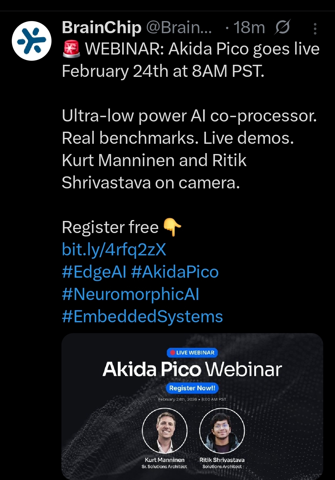 Join us on February 24th at 8:00 AM PST for an exclusive deep dive into the latest breakthrough in neuromorphic computing. BrainChip Solutions Architects Kurt Manninen and Ritik Shrivastava will introduce Akida Pico, our latest ultra-low power NPU core designed for the next generation of...brainchip.com