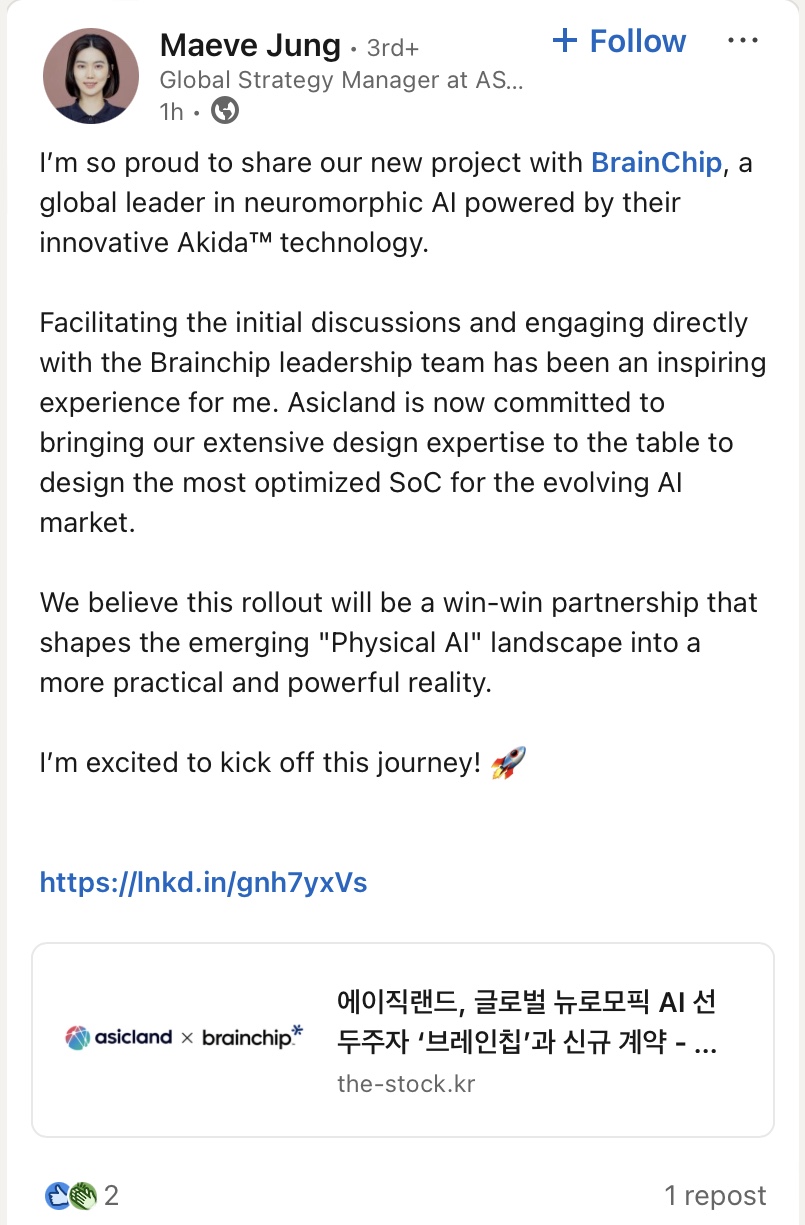 I’m so proud to share our new project with BrainChip, a global leader in neuromorphic AI powered by their innovative Akida™ technology. Facilitating the initial discussions and engaging directly with the Brainchip leadership team has been an inspiring experience for me. Asicland is now...www.linkedin.com