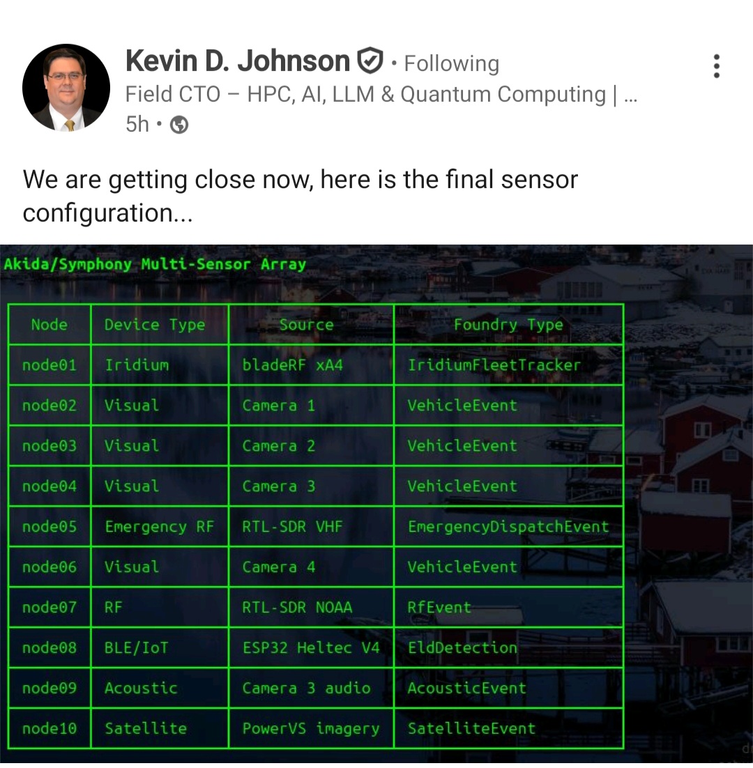 It would appear that all of Kevins previous tests were actually precursors for todays build of a multi modal sensor fusion edge system, which is what he was likely working on from the start.