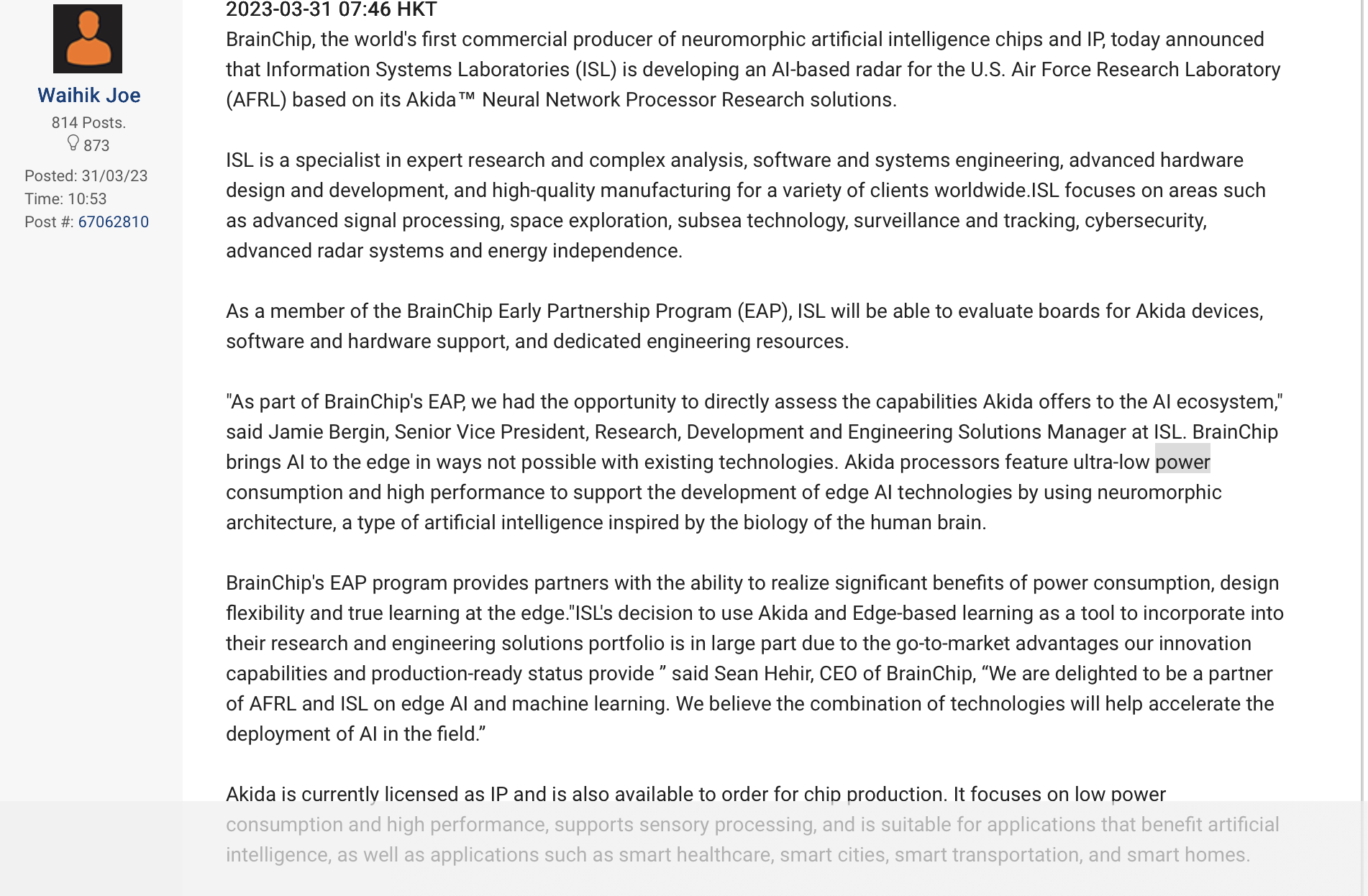 "As part of BrainChip's EAP, we had the opportunity to directly assess the capabilities Akida offers to the AI ecosystem," said Jamie Bergin, Senior Vice President, Research, Development and Engineering Solutions Manager at ISL.