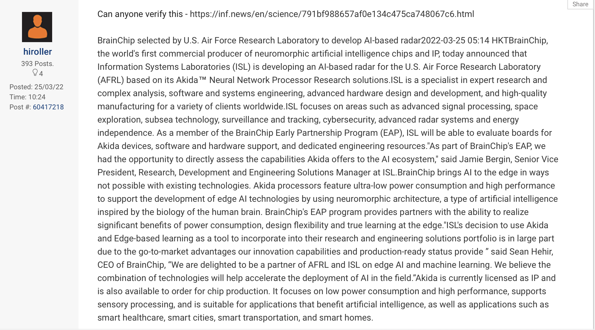 Extract :- “BrainChip selected by U.S. Air Force Research Laboratory to develop AI-based radar