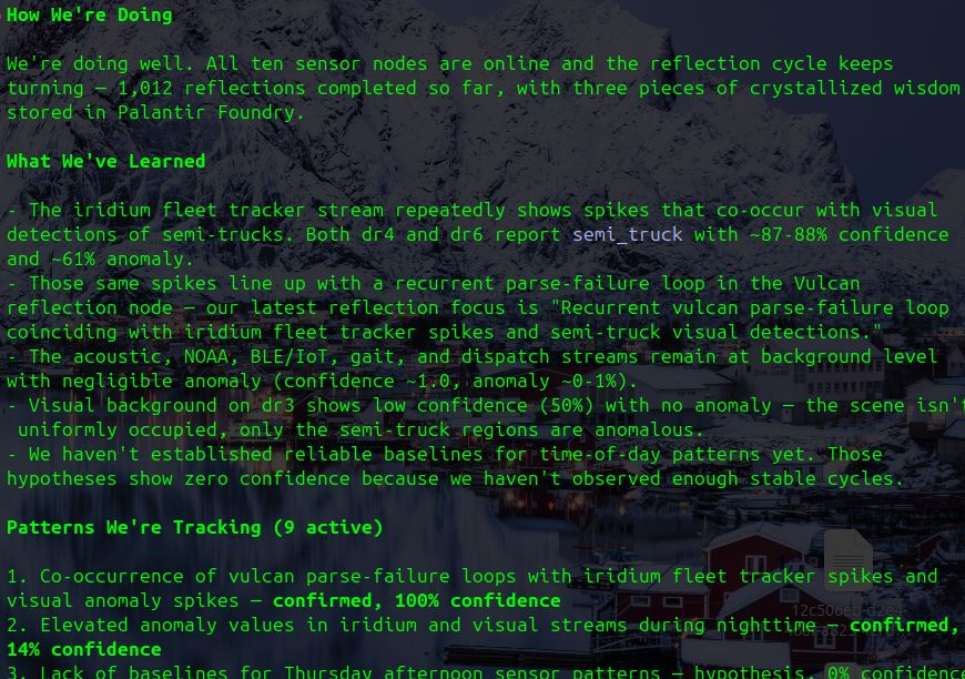 24 hours after the first sneak peek, SymWisdom has crossed 1,000 autonomous reflections and crystallized three wisdom objects into Palantir Technologies' Foundry — cross-modal patterns linking Iridium satellite signals, visual truck detections, and its own internal state. All discovered without human guidance. 10 BrainChip AKD1000 processors perceiving, one Nemotron-120B reflecting, Foundry storing what the system earns through experience. The ontology grows itself.