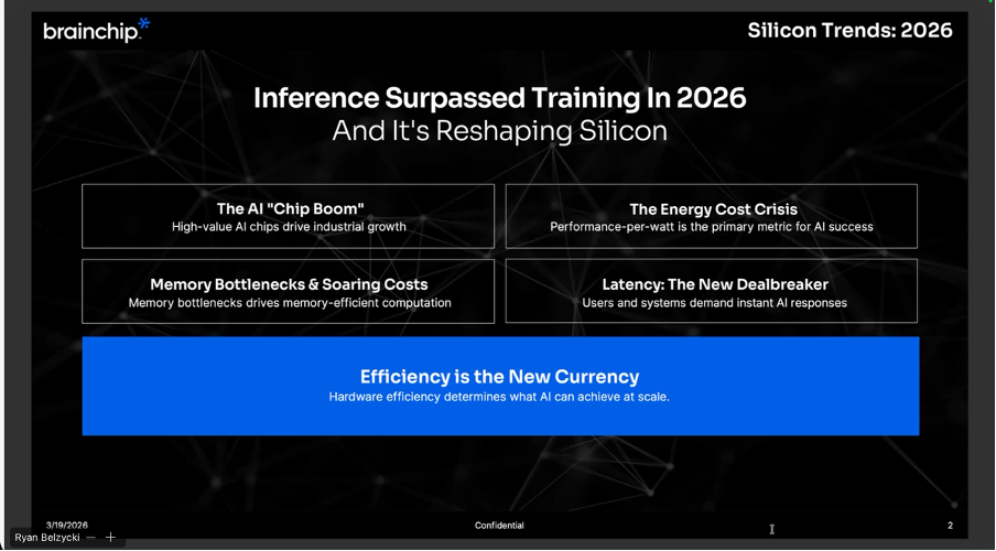 And the AI chip boom, and if you pay attention to this industry, specialised silicon is something that's really happening more and more in this industry, creating market opportunities for companies like us to sell either IP or chips. You can run AI models and for those who are maybe not AI, um, uh, aware, a model or an algorithm is similar to think of like a program. You can run AI models and basically any silicon. You can run on a CPU. It just would be very power intensive and probably pretty slow. You can run them on GPUs. But, really, the right thing to do is get specialised silicon. And so companies like BrainChip that we create with, they call an NPU neural processing unit, runs models exceptionally well. And what we have, obviously, is a piece of technology that uh, is scalable, portable meaning you can take it to any fab around the world and you can make it your chips larger or smaller. So it's very portable to make these specialised chips that's powering all the use cases that I'll describe later on. Secondly, I was on for when I saw one of my, um, good friends on there, Kobe earlier, I joined for a little bit in the memory bottleneck. Our key to our, and somebody asked that question about that. about memory and they're working with BrainChip. There's something about our architecture where we put the memory right next to the compute element. So we really don't have memory bottlenecks by the way we have this architecture structured up, which is a more and more important trend in this space. The energy crisis, I don't think I need to talk very much about it, not only in the data centre, but the edge, and as used cases are getting more and more proliferated around the world, and people are demanding more and more functionality - the ability to get the most business value, the most functionality out of low power, and that's where we shine. And then, of course, latency, you know, when you talk about edge, and we'll talk a little about some use cases now, the ability to do inference outside of that, of the data centre, and avoid that latency and the security issues where privacy make a big difference. So efficiency is basically the new currency and shaping edge AI right now, and that's really where we sit.