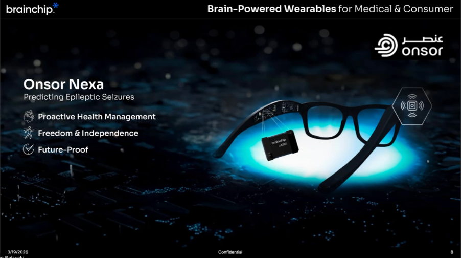 The next slide please? I want to bring out this one around the wearables market, to try to say that at the simplest level is a really good example for where we are to bring this to life, which is the possibility about a wearable. Now with Onsor, which is a company out of Oman, they've created these seizure, excuse me, epileptic seizure, prediction glasses. And in there, they have an Akida 1500, which is our chip, and they have a sensor in there, and it allows them with over the high 90%ile accuracy to predict if somebody's about to have a seizure within one hour. And I went to their kickoff event of roughly a year ago, and I heard a lot of stories from a lot of people during that time who were afraid to drive, afraid to leave their home, but now can do that because of these glasses. Their clinical trials are going very, very well, and Oman, their next plan is to roll that out to the rest of the region and then, of course, the rest of the world. You can see the tremendous impact to do this, and it's only possible if you have a chip that could do the inference locally, securely so they don't have their data go floating around, and an extended battery life. Right now, they're only charging these glasses once a week. Their previous trials with other vendors was every 12 hours. So you can see the impact of our kind of technology there.