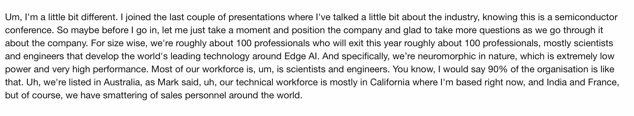 Um, I'm a little bit different. I joined the last couple of presentations where I've talked a little bit about the industry, knowing this is a semiconductor conference. So maybe before I go in, let me just take a moment and position the company and glad to take more questions as we go through it about the company. For size wise, we're roughly about 100 professionals who will exit this year roughly about 100 professionals, mostly scientists and engineers that develop the world's leading technology around Edge AI. And specifically, we’re neuromorphic in nature, which is extremely low power and very high performance. Most of our workforce is, um, is scientists and engineers. You know, I would say 90% of the organisation is like that. Uh, we're listed in Australia, as Mark said, uh, our technical workforce is mostly in California where I'm based right now, and India and France, but of course, we have smattering of sales personnel around the world.