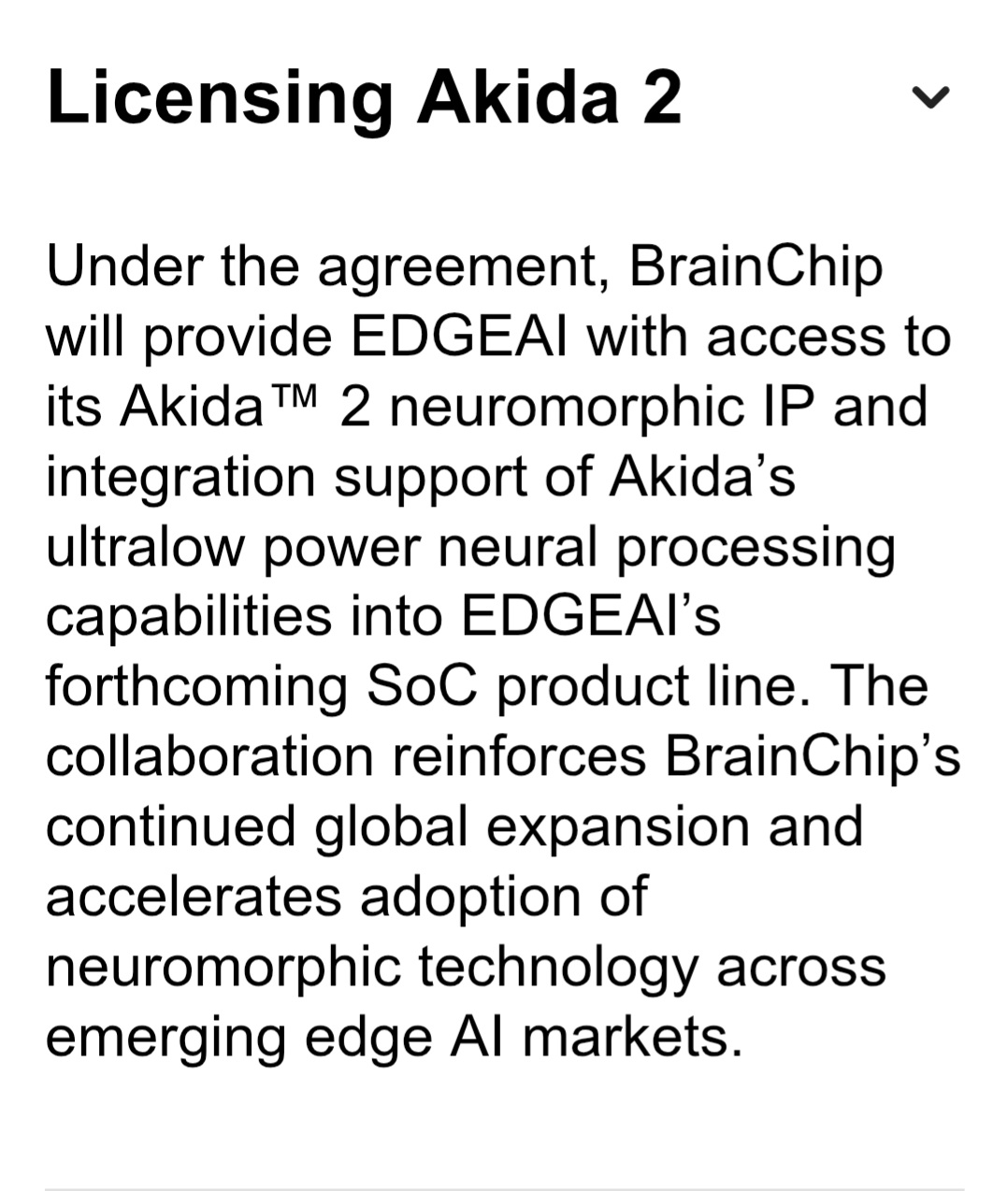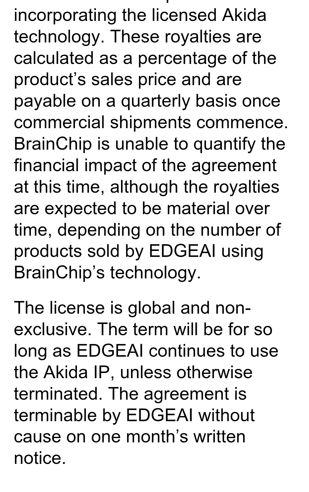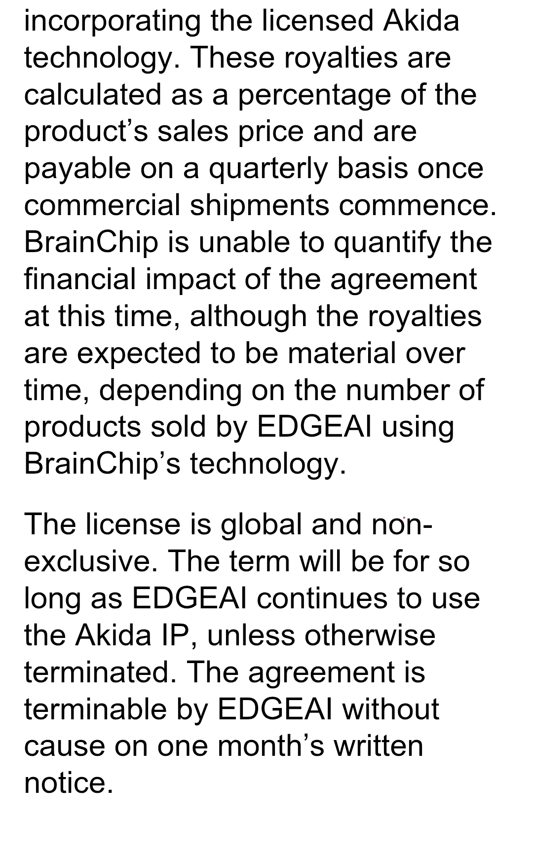 Re royalties, it says they will be tied to EDGEAI’s sales of products incorporating the licensed Akida technology. so, BrainChip would earn a percentage of the chips that include Akida, payable quarterly once commercial shipments begin.