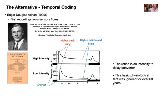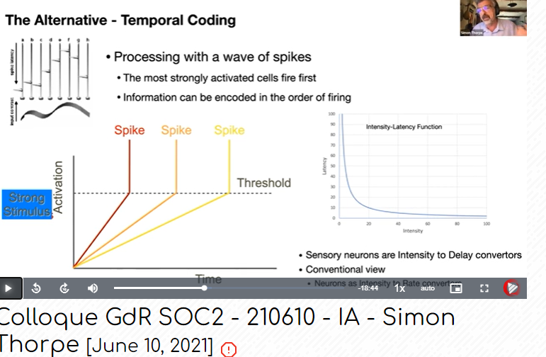This is Simon Thorpe's presentation: "The precision tradeoff" which explains temporal coding. It's the best explanation of "spikes good - floating point bad" that you could hope to find.