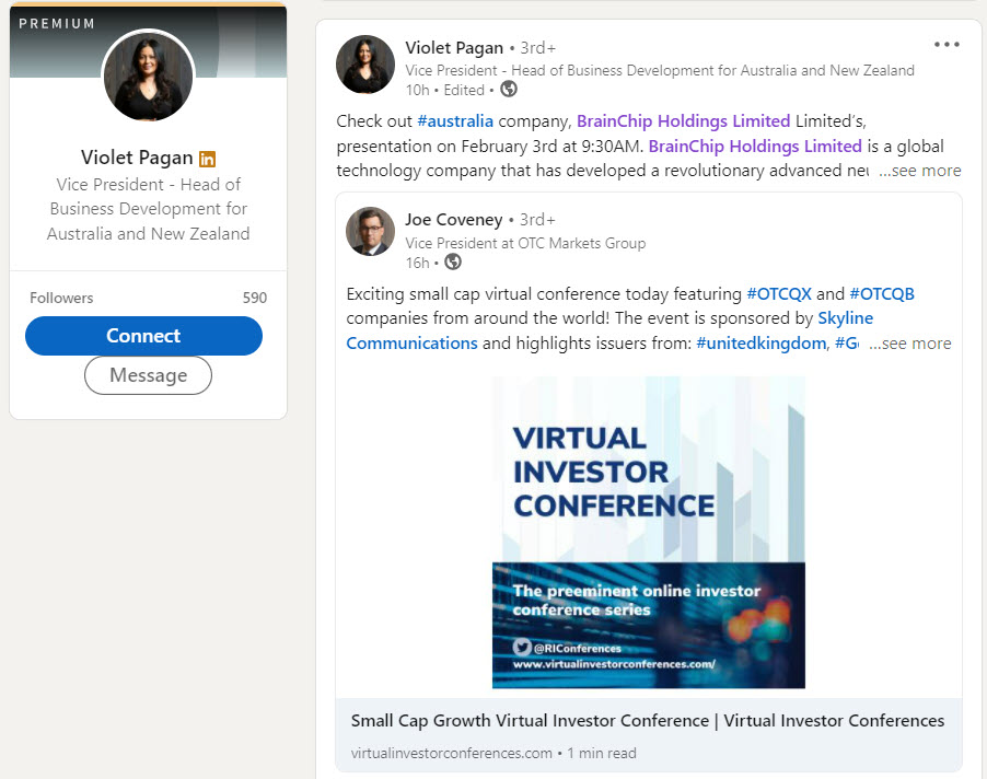 Violet - Vice President, Head of Business Development for Australia and New Zealand for the OTC Markets Group posted this on Linkedin about BrainChip
