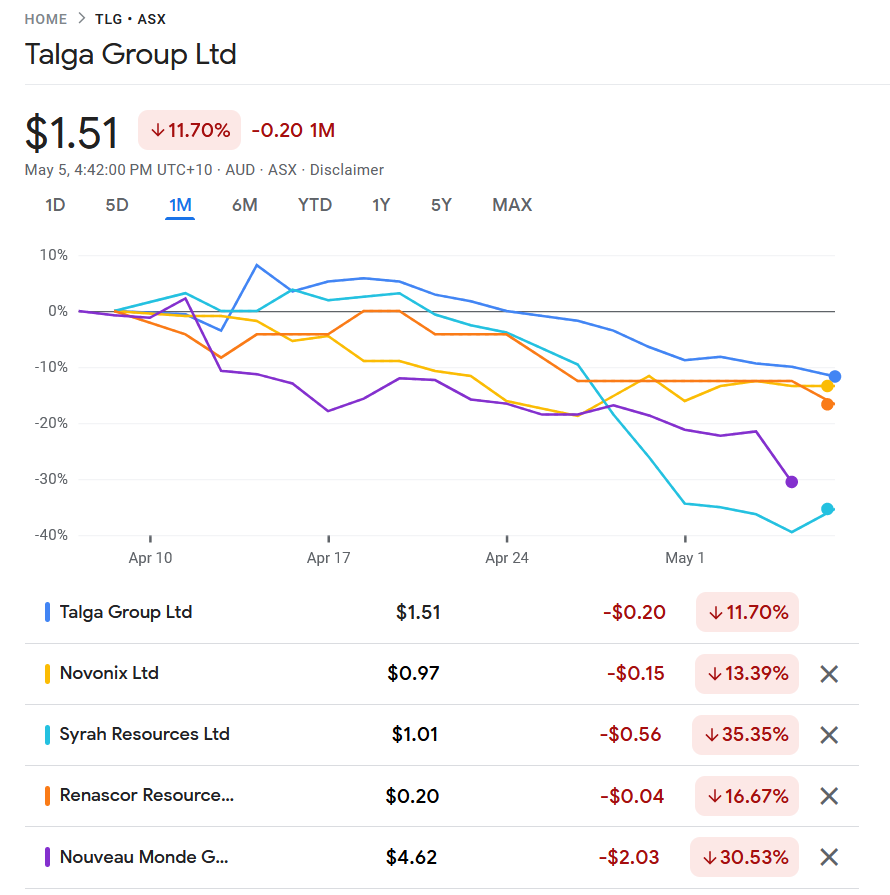 Link: https://www.google.com/finance/quote/TLG:ASX?sa=X&ved=2ahUKEwi-1aWW193-AhUKg_0HHRpODhMQ_AUoAXoECAEQAw&comparison=ASX:NVX,ASX:SYR,ASX:RNU,CVE:NOU&window=1M